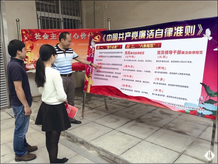 為增強(qiáng)學(xué)習(xí)貫徹的自覺性、主動(dòng)性,把學(xué)習(xí)貫徹與具體工作實(shí)際結(jié)合起來(lái),公司紀(jì)檢監(jiān)察室在第一時(shí)間進(jìn)行宣傳貫徹。一是以短信形式,向公司全體黨員和中層以上干部發(fā)送2期《廉政知識(shí)學(xué)習(xí)卡》短信,并就“妄議中央”、“老鄉(xiāng)會(huì)、校友會(huì)、戰(zhàn)友會(huì)”、“四類人員不得買賣股票”、“社會(huì)主義核心價(jià)值觀”等內(nèi)容分4次發(fā)送短信進(jìn)行解讀,以最快捷的方式、最簡(jiǎn)潔的字句讓黨員干部及時(shí)了解和知曉《準(zhǔn)則》和《條例》的關(guān)鍵內(nèi)容;二是組織黨委中心組成員集中專題學(xué)習(xí);三是制作四版《準(zhǔn)則》和《條例》宣傳版報(bào),分別布置于二樓、三樓辦公走廊;四是為全體黨員訂購(gòu)人手一份《中國(guó)共產(chǎn)黨廉潔自律準(zhǔn)則、中國(guó)共產(chǎn)黨紀(jì)律處分條例、中國(guó)共產(chǎn)黨章程》單行本,全部發(fā)放到每一位黨員手中,要求原原本本、逐字逐句認(rèn)真學(xué)習(xí);五是在公司OA信息系統(tǒng)黨務(wù)紀(jì)工團(tuán)門戶發(fā)布通知學(xué)習(xí)。