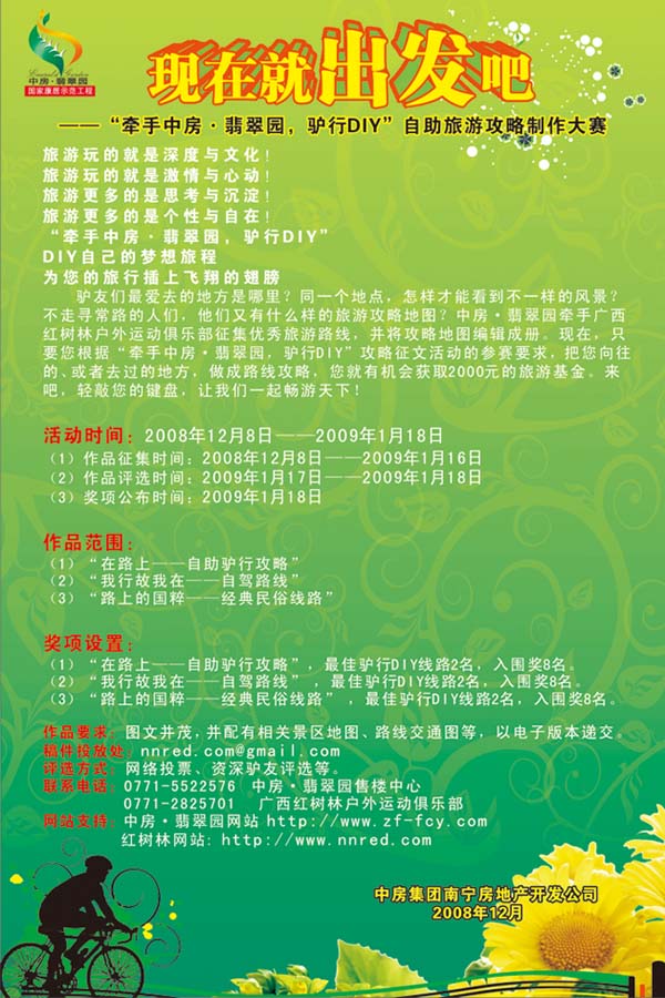 活動說明:由旅游愛好者(年滿22歲)推薦旅游DIY線路,線路可以是您曾經(jīng)嘗試過的旅游行程,或者是您自行設(shè)計、獨具特色、安排合理的旅游行程。一經(jīng)選中,線路設(shè)計者將能獲得最高人民幣兩千元的獎金。線路將按照區(qū)域及特色分為“區(qū)內(nèi)游”“國內(nèi)自駕游”“民俗風情游”三個部分。各部分評選詳情請參看下文: